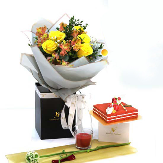 Yellow Touch Bouget with Red Velvet cakes 500gm